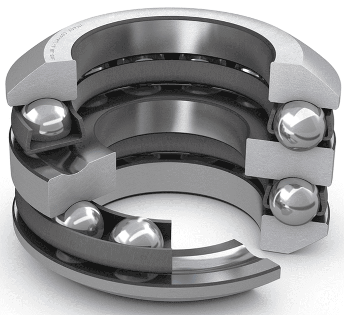 Double direction thrust ball bearings with a sphered housing washer can accommodate axial loads in both directions, but they must not be subjected to any radial load. Many of the components are interchangeable. These bearings can be used together with a sphered seat washer adjacent to the housing washer or adjacent to a machine component manufactured with a sphered surface. The shaft washers have a ground bore that enables an interference fit.