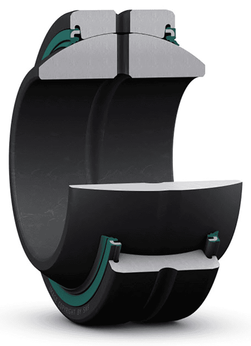These spherical plain bearings have a steel/PTFE sintered bronze contact surface combination and are maintenance-free. The sliding surfaces have to be externally protected from contaminants. These bearings are also available with a wider inner ring and a larger outside diameter (suffix GEH), which enable higher load ratings and larger tilt angles.